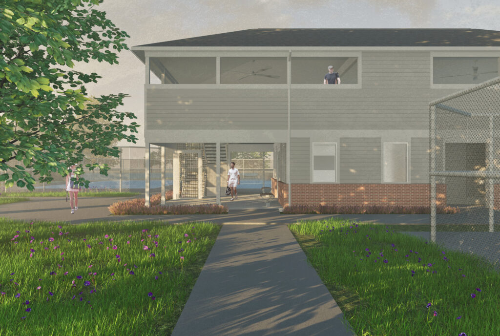 This new tennis facility replaces the existing pro shop with a larger, more welcoming soap featuring a shaded front porch, pro shop, equipment area, and restrooms on the main level; plus a spacious covered observation deck above with views of all eight surrounding courts.